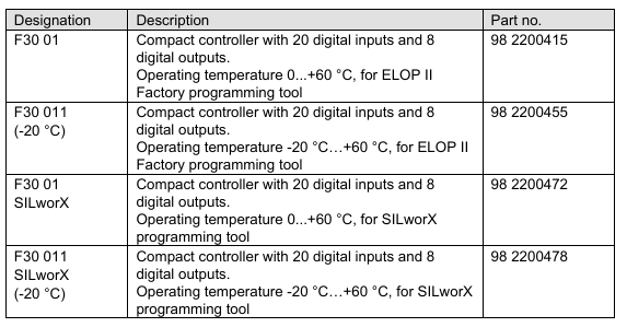 The safety-related F30 controller is a compact system located in a metal enclosure with 20 digital inputs and 8 digital outputs. The controller is available in a model variant for SILworX and a model variant for ELOP II Factory, see Chapter 3.2. All variants are described in this manual. The device is suitable for mounting in Ex-zone 2, see Chapter 4.1.3.